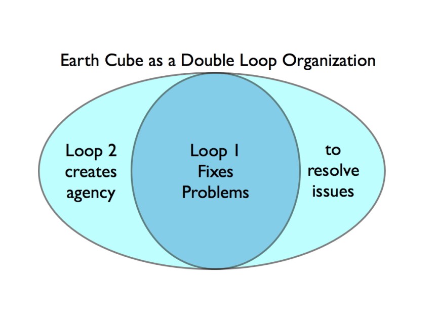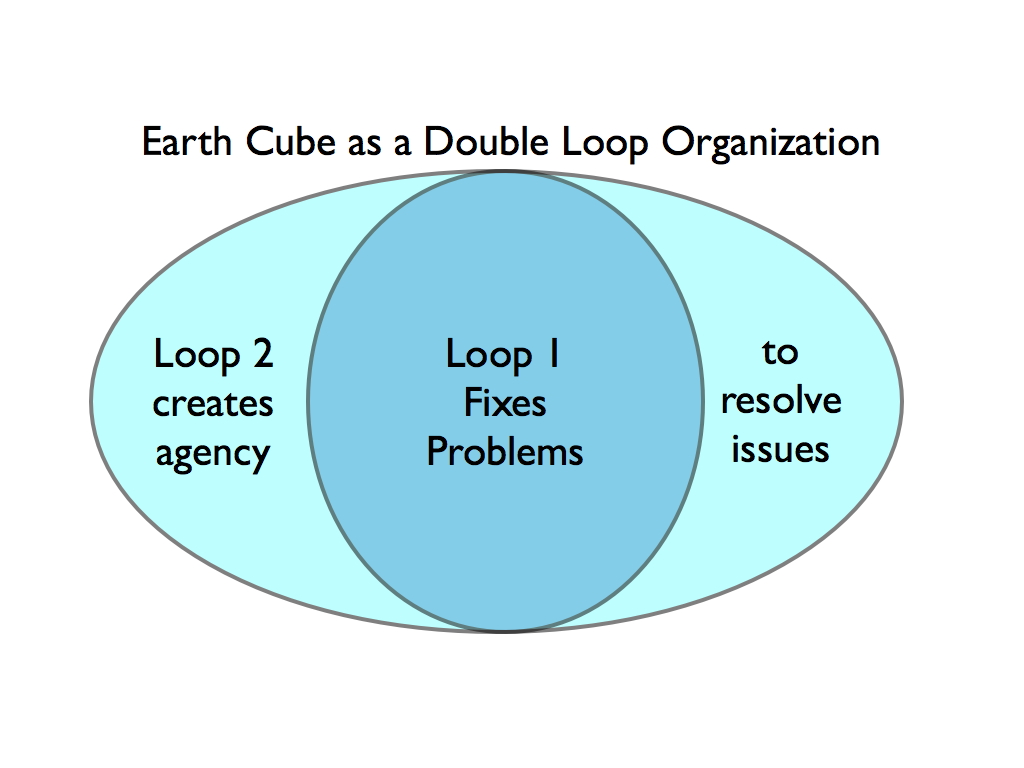 First loop governance fixes problems for the Earth Cube member community. Second loop governance creates what sociologists call “agency.” This agency is the ability/capability to govern how the community will fix its problems. Does there need to be a committee? Who gets to be on the committee? Who is involved in a decision? Who do you talk to if you feel your voice has not been heard? Second-loop governance is responsible to answer all of these questions. In a typical NSF project, this is called “management.” PI and Co-PIs are charged to create and implement an effective management plan. But who should create and implement an effective second-loop governance plan? The current vision for Earth Cube puts the community into this role. Members of the community are stepping up to guide this process. But a much larger community-wide conversation will need to happen before any second-loop governance plan can be implemented.